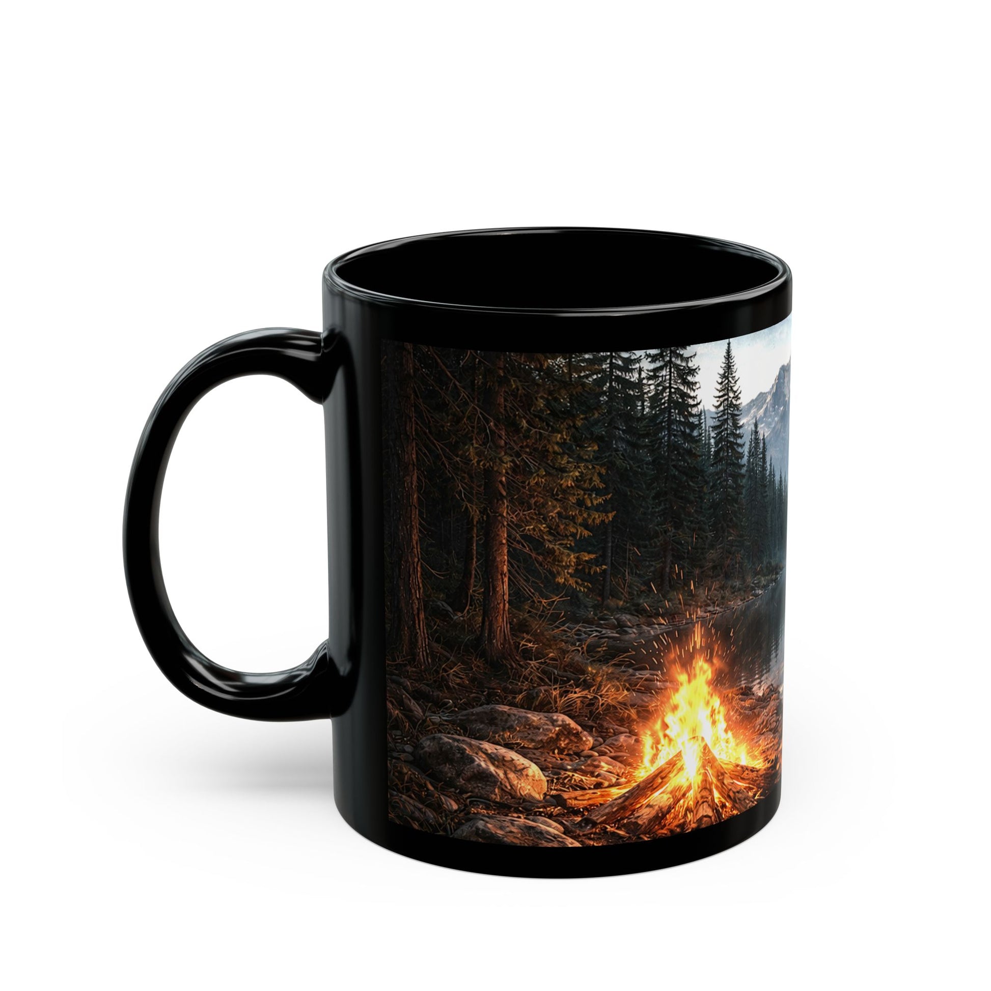 Hold a quiet evening in your hands. This black ceramic mug frames a campfire scene—flickering embers, a dark pine line, a glassy lake, and distant mountains—so each sip feels like settling in by the campfire after a long day. It sits warm in your grip, the glossy finish deepening the night-sky tones while bright, crisp inks keep the scene alive cup after cup. Use it for slow mornings before a trailhead, low-key nights at the cabin, or when you want a moment of stillness after a long day. The C-shaped handle fits naturally in your hand; the sizable 11oz or 15oz option gives you the right pour for coffee, tea, or cocoa. Safe for microwave and dishwasher and made with lead- and BPA-free materials, this mug brings a little outdoor calm to everyday routines.