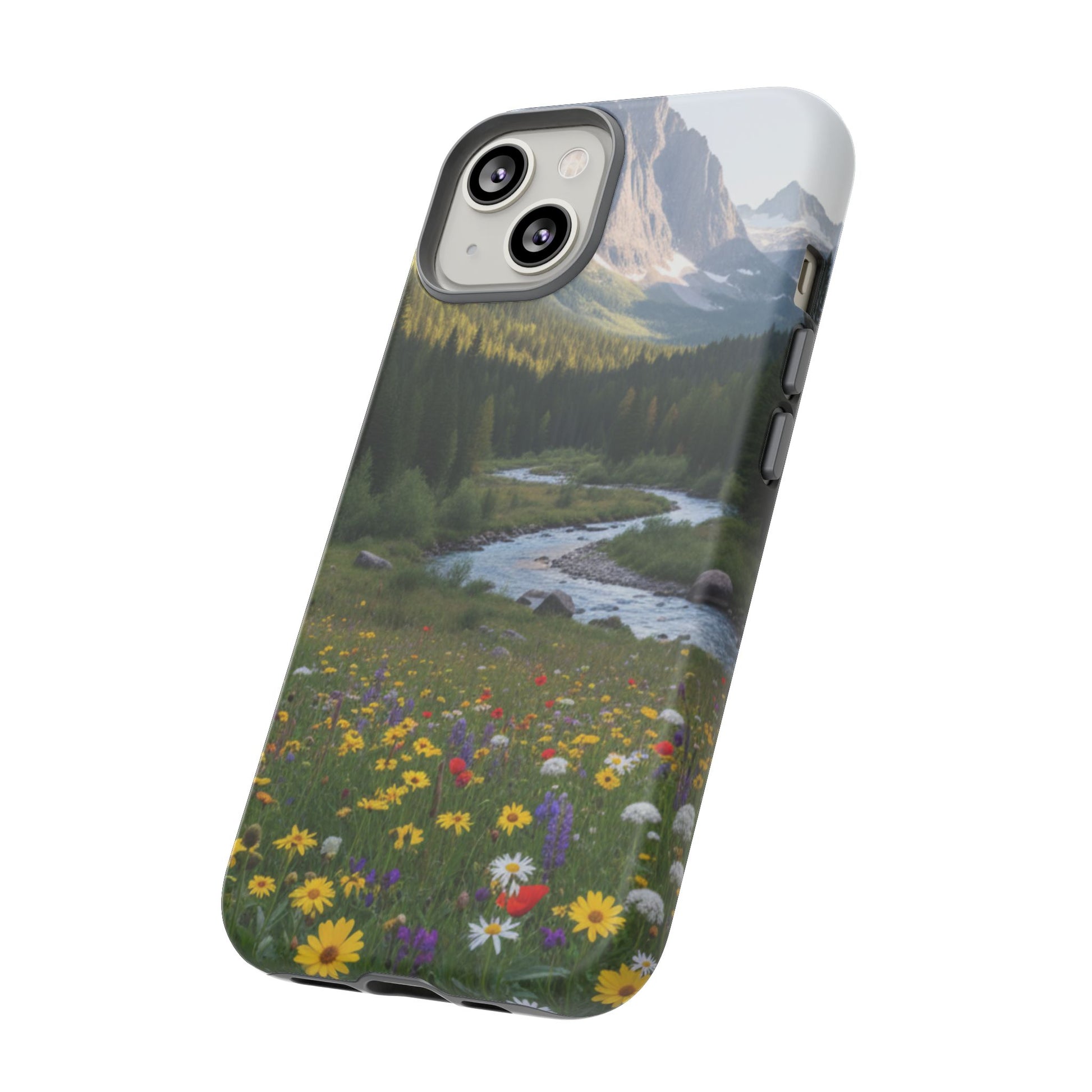 Mountain Meadow Phone Case — Vibrant Wildflowers, Stream & Mountain Design