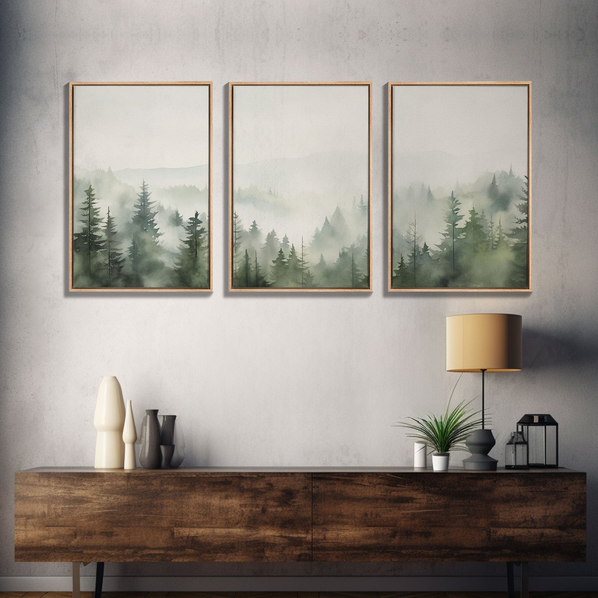 3 Panel Emerald Green Pinetree Mountain | Framed Canvas Print